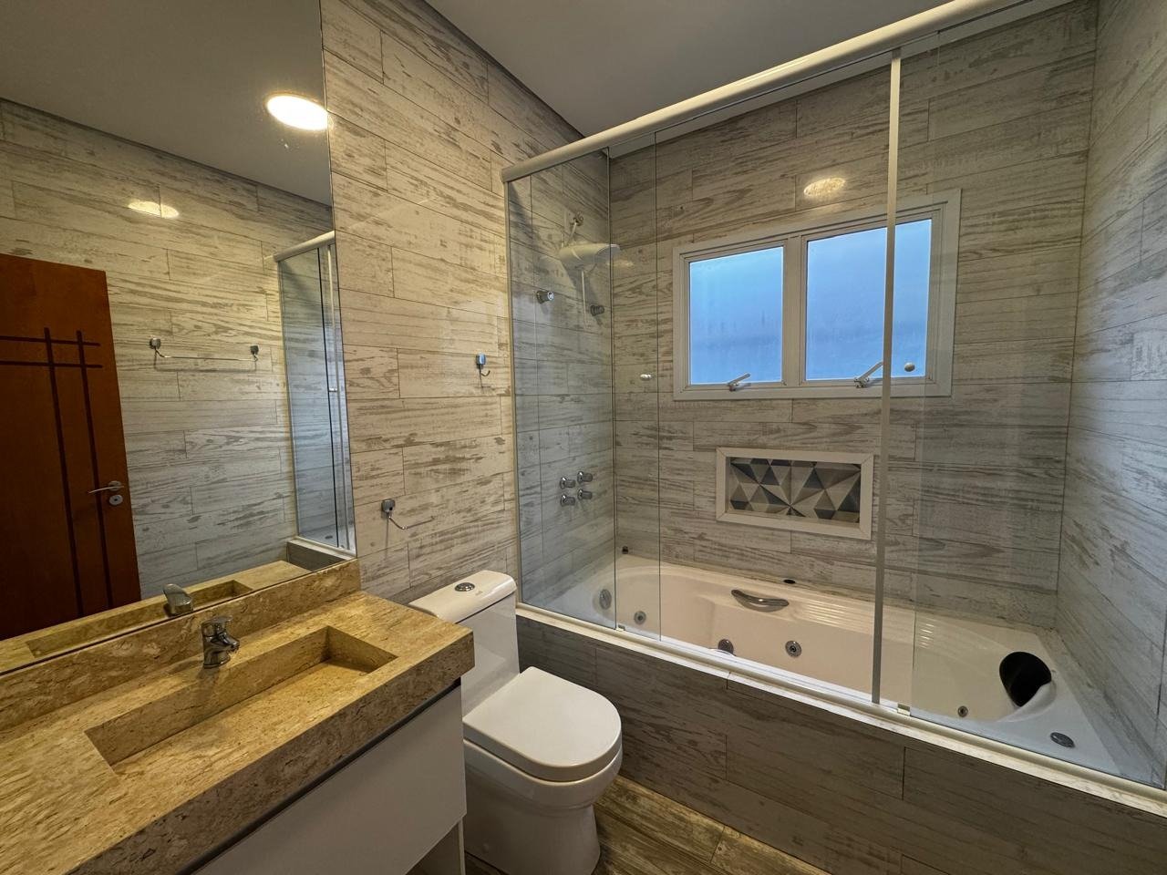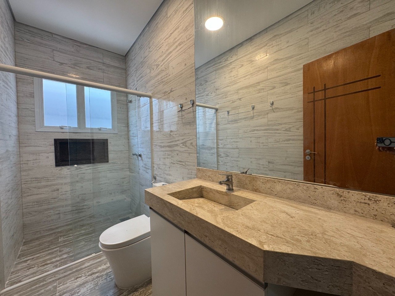 Conta ainda com um banheiro social com móveis planejados e box