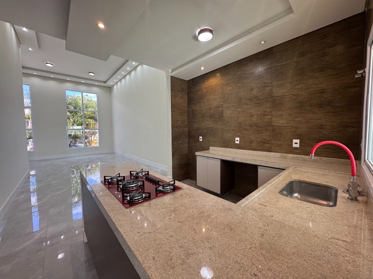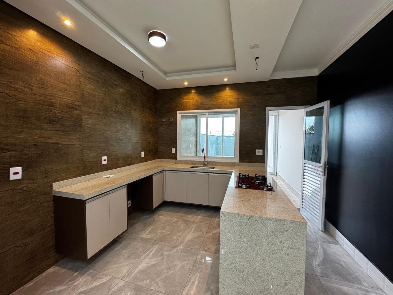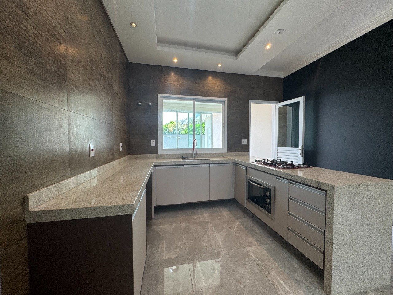 A cozinha é planejada, equipada com forno embutido e cooktop.